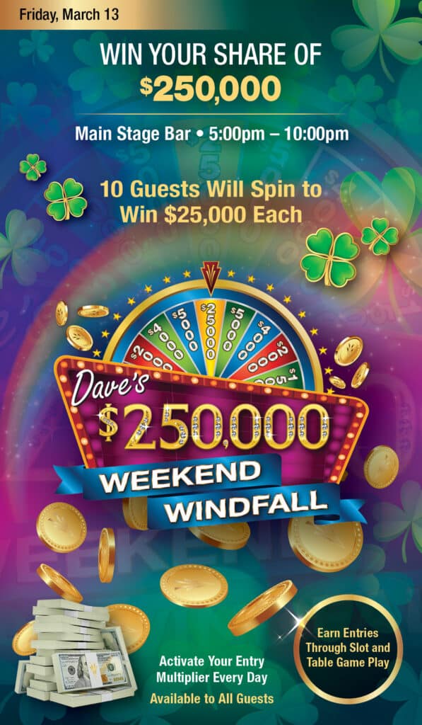Únase a nosotros para disfrutar de Dave’s $250,000 Weekend Windfall que tendrá lugar el viernes 13 de marzo. Cada hora, de 5pm a 9pm, 10 ganadores girarán la ruleta para ganar entre $200 y $1,000 cada uno en MOREPLAY®. Luego, a las 10pm, 10 afortunados ganadores girarán la ruleta para ganar $25,000 cada uno. ¡Visite nuestro Main Stage Bar para ganar en grande!