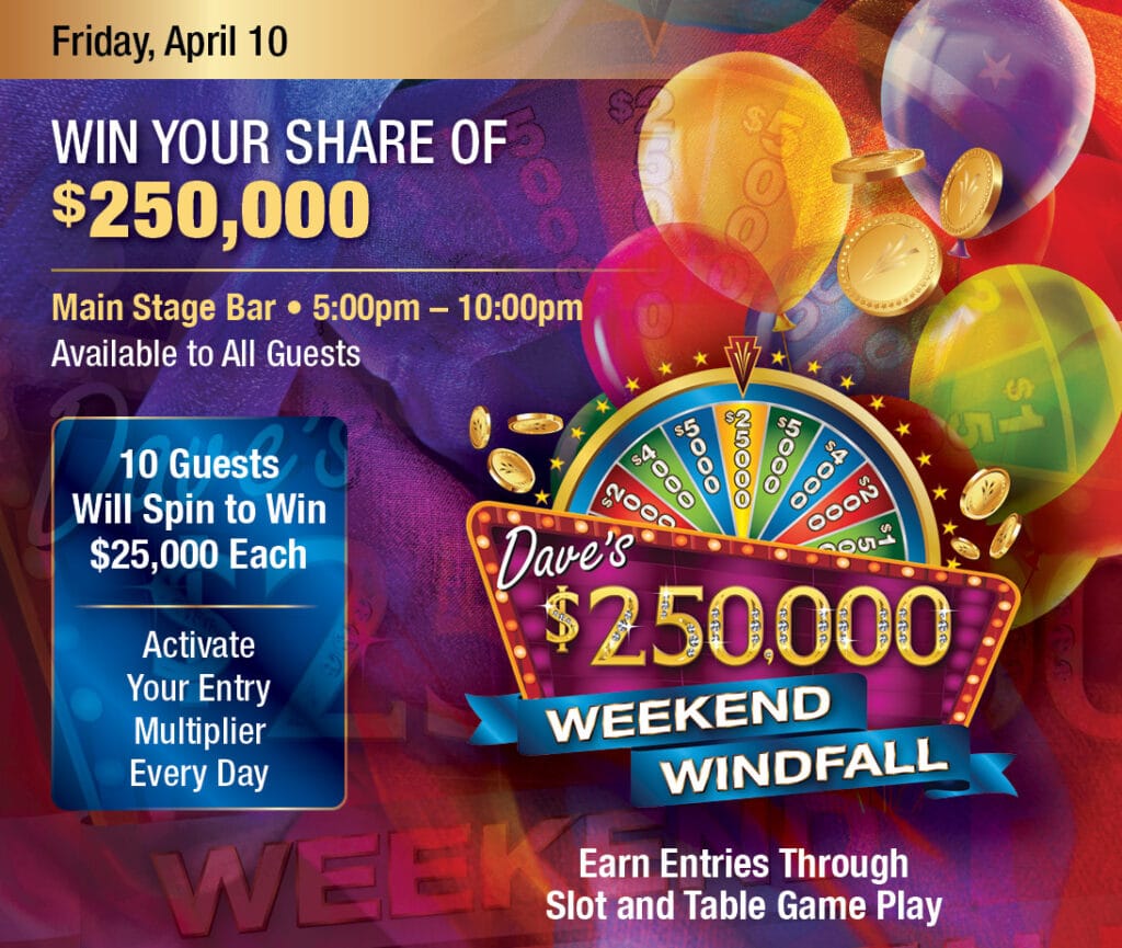 Únase a nosotros para disfrutar de Dave’s $250,000 Weekend Windfall que tendrá lugar el viernes 10 de abril. Cada hora, de 5pm a 9pm, 10 ganadores girarán la ruleta para ganar entre $200 y $1,000 cada uno en MOREPLAY®. Luego, a las 10pm, 10 afortunados ganadores girarán la ruleta para ganar $25,000 cada uno. ¡Visite nuestro Main Stage Bar para ganar en grande!
