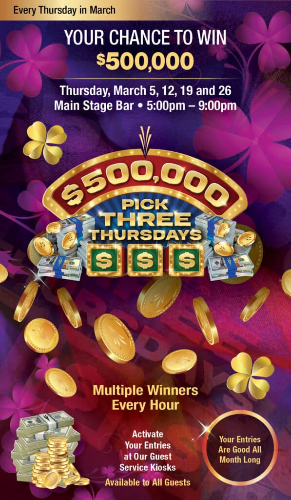 Participe en nuestra promoción $500,000 Pick Three Thursdays donde podrá ganar un gran premio. Cada hora, de 5pm a 8pm, cinco participantes ganarán MOREPLAY® y luego, a las 9pm, tres invitados seleccionarán cada uno tres sobres para tener la oportunidad de ganar $500,000. ¡Visite nuestro Main Stage Bar todos los jueves de 5pm a 9pm para ganar en grande!