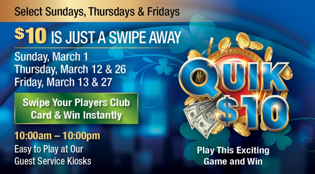 ¡Gane $10 al instante en el emocionante juego de quiosco de Valley View, Quik $10! Los invitados podrán pasar su tarjeta de El Club de Jugadores en nuestros quioscos de servicio al cliente para ganar!