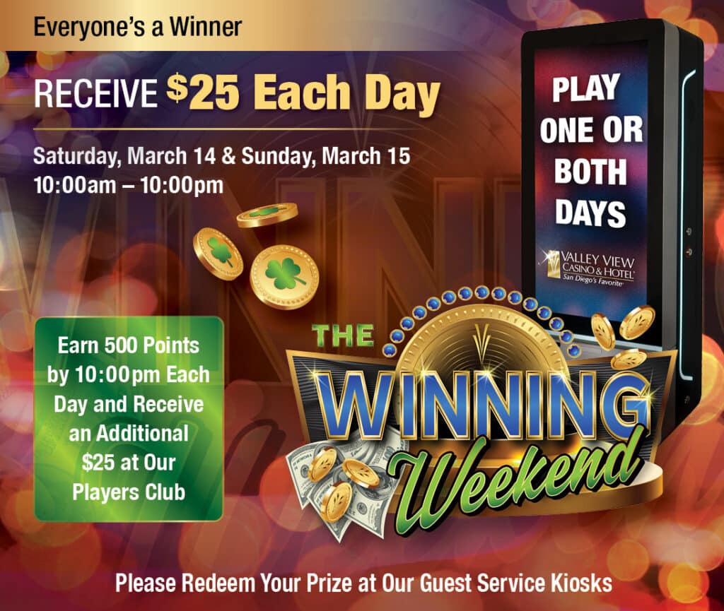 Los invitados pasarán su tarjeta de El Club de Jugadores en nuestros quioscos de servicio al cliente para recibir $25 al instante durante nuestro evento Winning Weekend que tendrá lugar el sábado 14 de marzo y el domingo 15 de marzo. Cada invitado puede participar en uno o ambos días.
