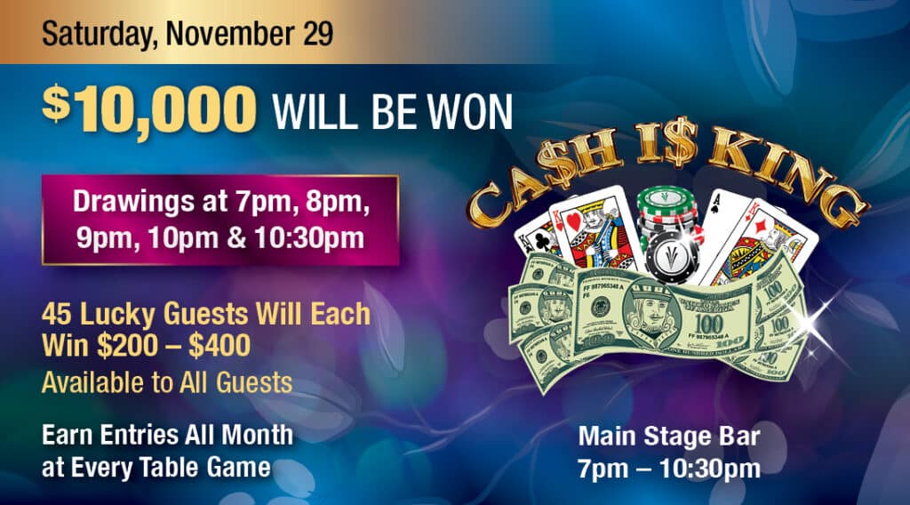Earn your entries all month long through table game play by using your Players Club card, and every Tuesday and Wednesday, earn double the entries by taking advantage of Cash Is King Double Entries. Then, join us on Saturday, November 29 at the Main Stage Bar for this month’s event.