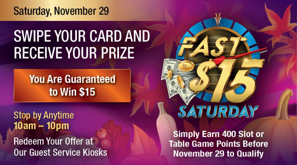 Any of Our Guest Service KiosksFast $15 Saturday Join us and swipe your Players Club card to receive $15 instantly. Qualifying is easy! Please visit our Players Club to learn how you can qualify for […]