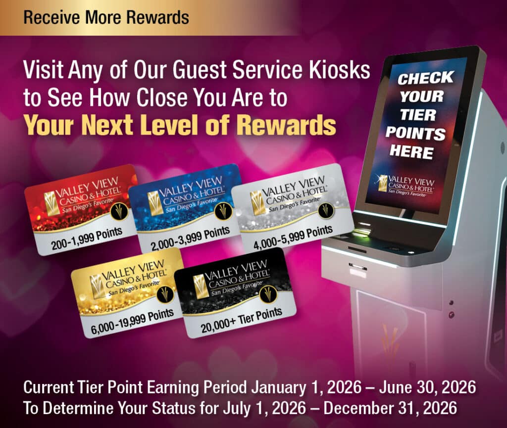 Valley View Casino & Hotel’s Guest Service Kiosks are located throughout the casino and feature everything you need to get the most out of your play. Guests can visit any casino kiosk to learn about all of our exclusive promotions, drawings and how you can enter to win great prizes every month, such as cash, free slot play and more.