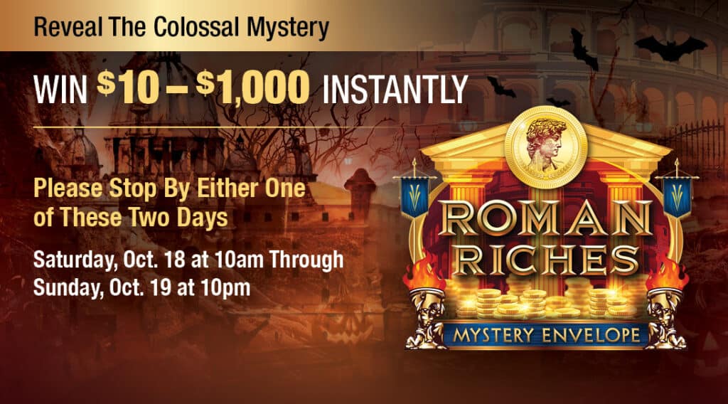 Are you ready to discover your prize? Invited guests will bring their unopened Mystery Envelope to the Players Club on October 18 or 19 to reveal the prize of $10-$1,000. To learn more about our Mystery Envelope promotion and to find out how you can participate, please visit our Players Club.