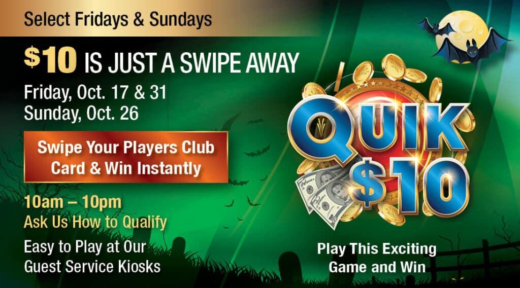 Win $10 instantly at Valley View Casino’s exciting kiosk game, Quik $10! Invited guests will swipe their Players Club card at our guest service kiosks to win!
