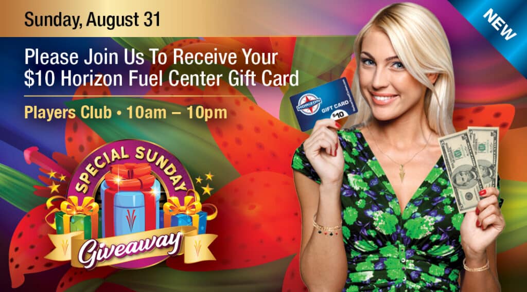To thank you for your loyalty, we invite you join us on Sunday, August 31 to pick up your Special Sunday Giveaway gift! Join us at the Players Club from 10am–10pm to receive your $10 Horizon Fuel Center Gift Card, courtesy of Valley View Casino & Hotel.