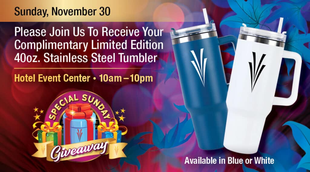 To thank you for your loyalty, we invite you join us on Sunday, November 30 to pick up your Special Sunday Giveaway gift! Join us at the Players Club from 10am–10pm to receive your Limited edition 40oz. Stainless Steel Tumbler courtesy of Valley View Casino & Hotel.