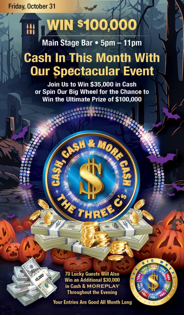 Join us for our NEW spectacular giveaway, The Three C’s: Cash, Cash & More Cash! On Friday, October 31, you could win $35,000 cash or a spin on our Big Wheel for the chance to win the ultimate prize of $100,000!