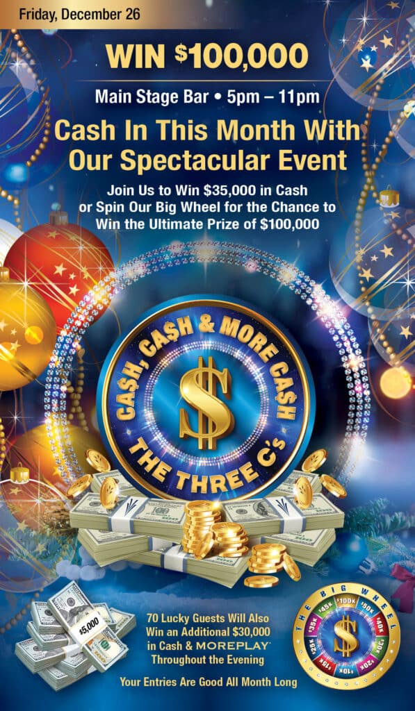 Join us for our NEW spectacular giveaway, The Three C’s: Cash, Cash & More Cash! On Friday, December 26, you could win $35,000 cash or a spin on our Big Wheel for the chance to win the ultimate prize of $100,000!