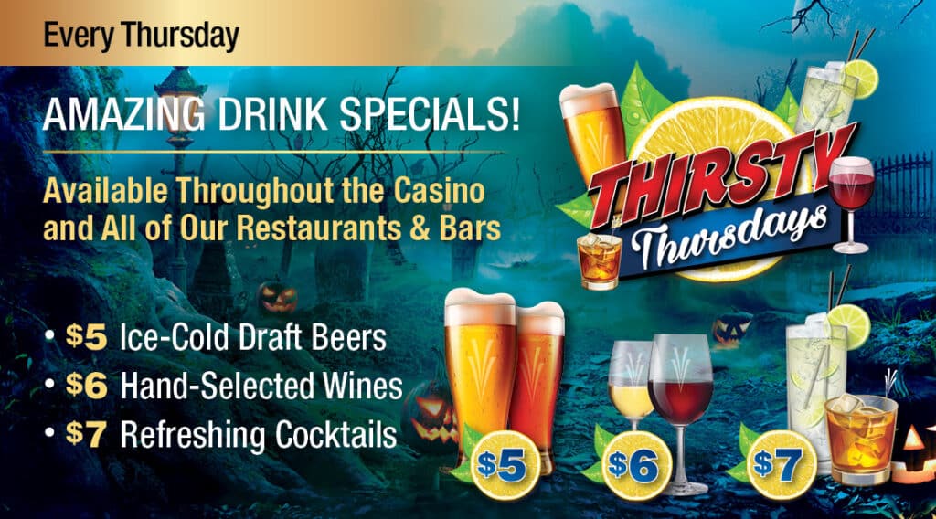 Enjoy these specials at any of our award-winning restaurants, convenient bars or while you play your favorite slots and table games. You won’t want to miss out on these thirst-quenching deals!