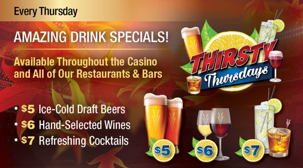 Enjoy these specials at any of our award-winning restaurants, convenient bars or while you play your favorite slots and table games. You won’t want to miss out on these thirst-quenching deals!