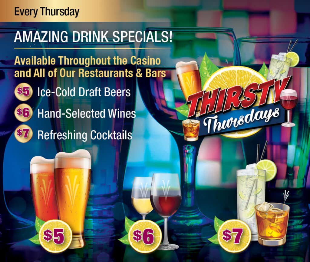 Join us at Valley View Casino & Hotel for our Thirsty Thursdays promotion where you can sip on $5 ice-cold draft beers, $6 hand-selected wines and $7 refreshing cocktails.
