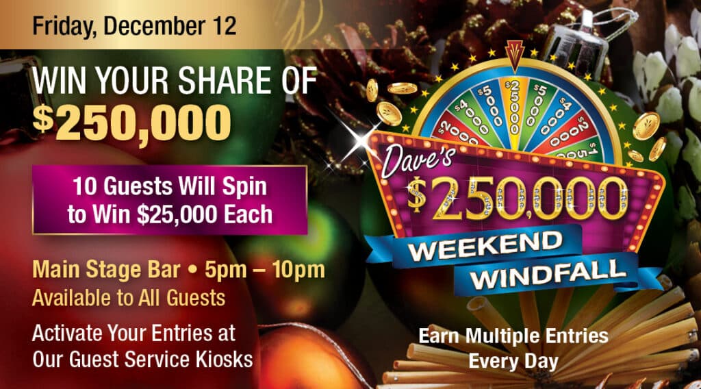 Please join us for Dave’s $250,000 Weekend Windfall happening on Friday, December 12. Every hour from 5pm–9pm, 10 winners will spin to win $200–$1,000 each in MOREPLAY®. Then, at 10pm, 10 additional lucky winners will spin to win $25,000 each. Be at our Main Stage Bar to win big!