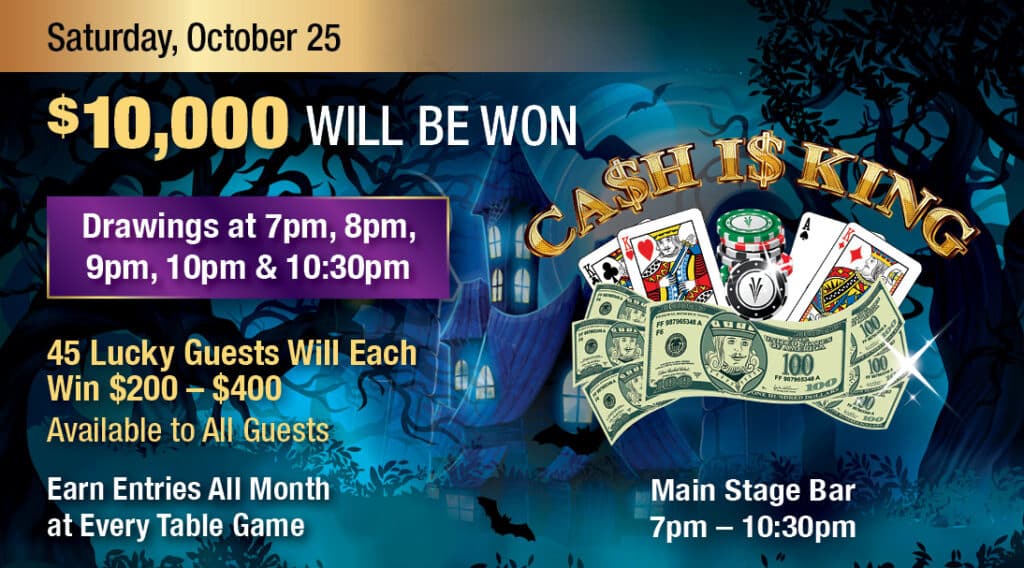 Earn your entries all month long through table game play by using your Players Club card, and every Tuesday and Wednesday, earn double the entries by taking advantage of Cash Is King Double Entries. Then, join us on Saturday, October 25 at the Main Stage Bar for this month’s event.